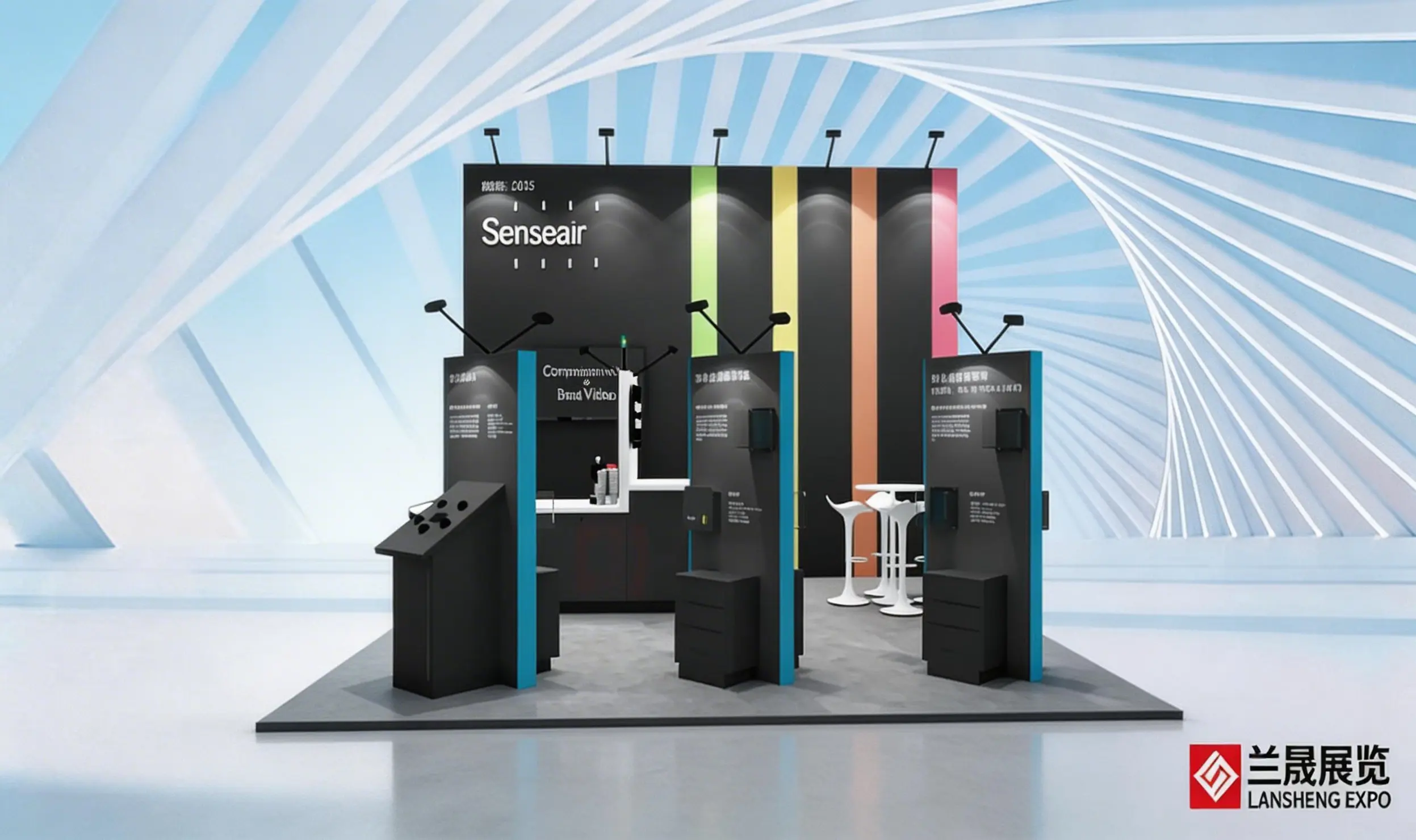 以全黑色调为画布,搭配彩色竖条与蓝边展具,设计简用跳色元素的巧妙运用打破单调