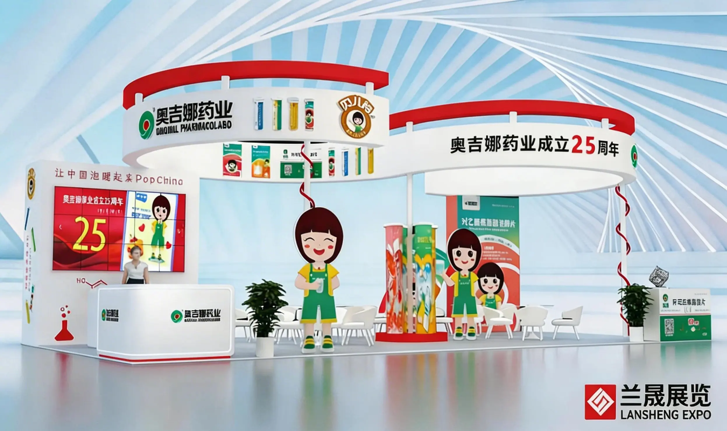 医药展会设计搭建,展台功能区为接待区、洽谈区、产品展示区、多媒体展示区、储藏室