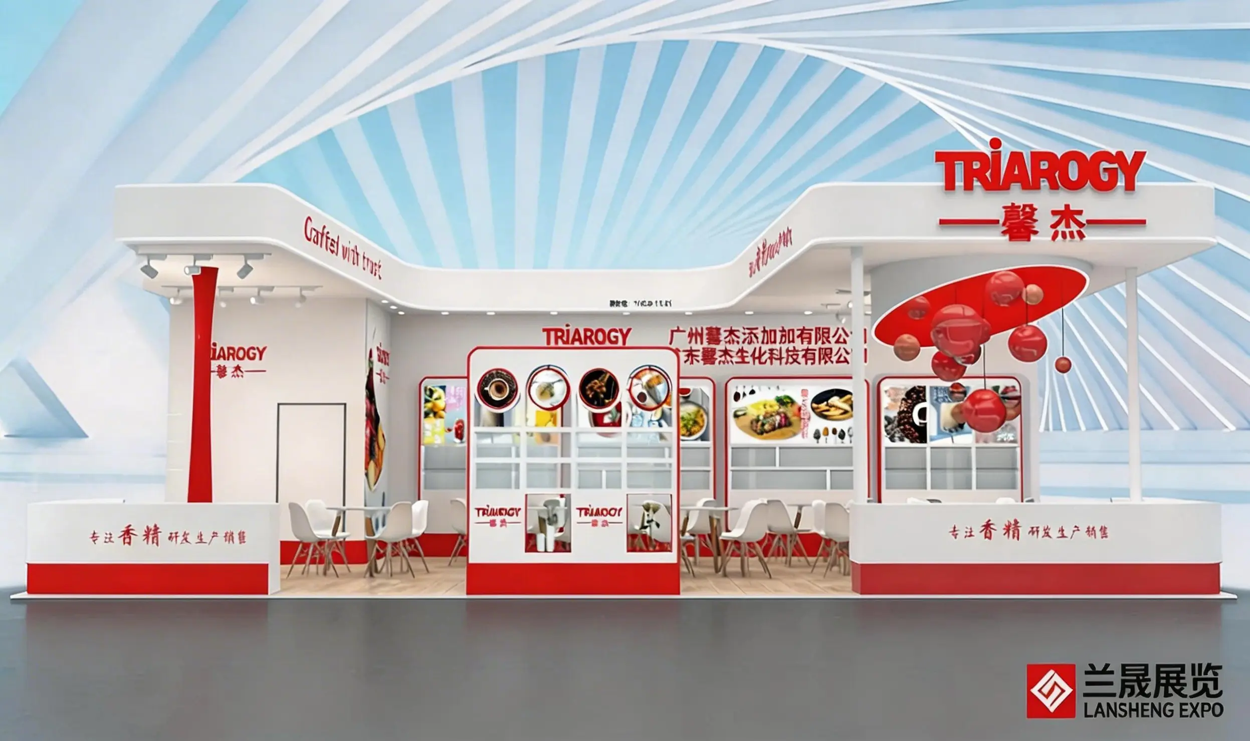 FIC食品添加剂展会设计搭建,该展台功能区域包含接待区、洽谈区、产品展示区、品牌展示区、存储区