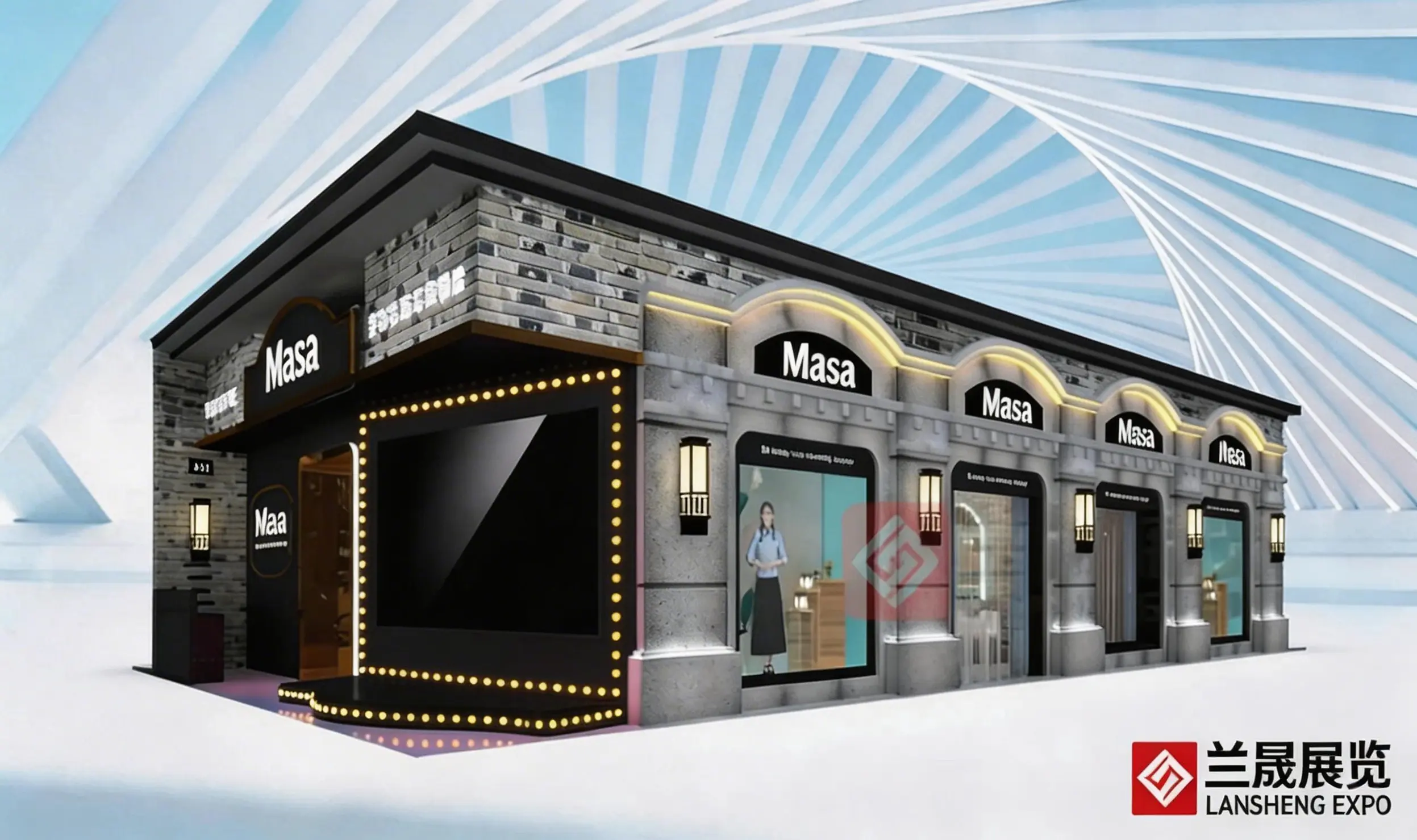 广州美博会展台设计搭建,该展台采用封闭式设计,选用木纹墙纸替代实木材质,既还原了传统建筑的温润质感,又有效控制了成本。入口处配置的LED大屏定制了复古边框纹样,配合暖黄色调灯光,营造出怀旧氛围。