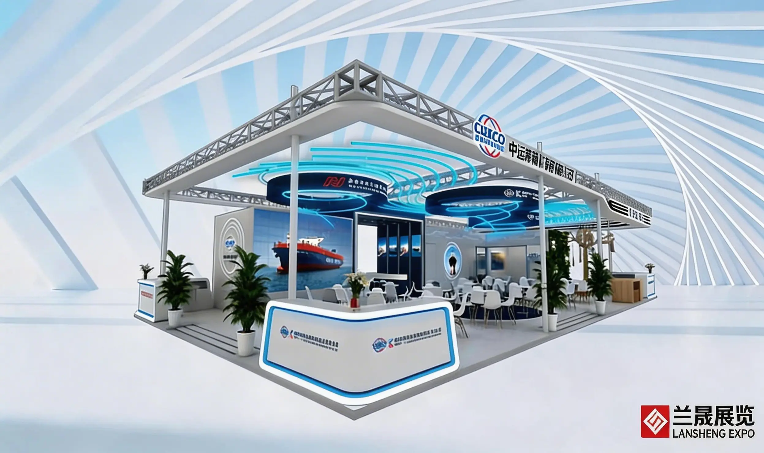 集装箱多式联运亚洲展会设计搭建,展台功能分区:接待区、洽谈区、封闭式会议区、存储区。